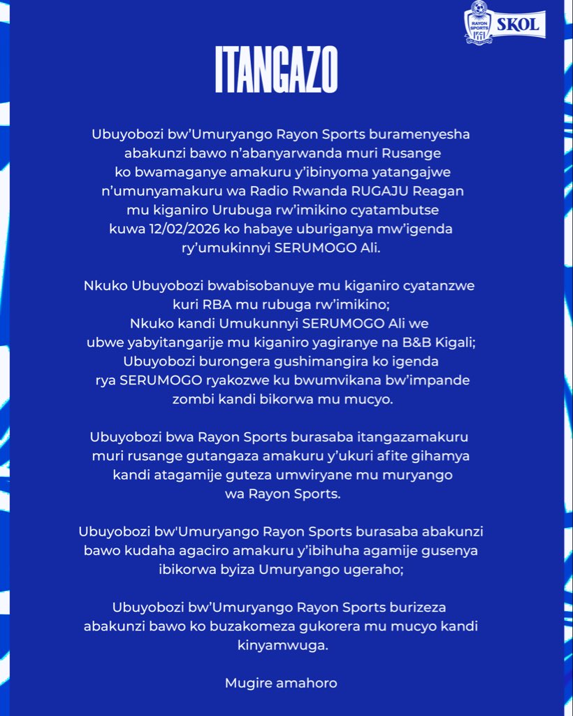 Muri iryo tangazo, bwagize buti “Ubuyobozi bw’Umuryango Rayon Sports buramenyesha abakunzi bawo n’Abanyarwanda muri rusange ko bwamaganye amakuru y’ibinyoma yatangajwe n’umunyamakuru wa Radio Rwanda, Rugaju Reagan, mu kiganiro Urubuga rw’Imikino cyatambutse ku wa 12/02/2026, ko habaye uburiganya mu igenda ry’umukinnyi Serumogo Ali.”