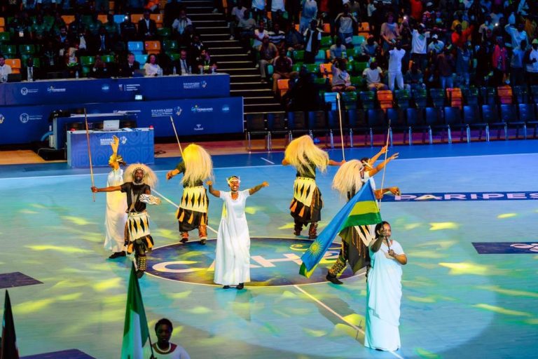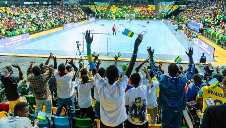 Imbere y’imbaga y’abafana n’abayobozi bakuru barimo Minisitiri wa Siporo, Nelly Mukazayire, na Perezida w’Impuzamashyirahamwe y’Umukino wa Handball muri Afurika (CAHB), Dr. Mansourou Aremou, u Rwanda rwatangiranye imbaraga nyinshi.